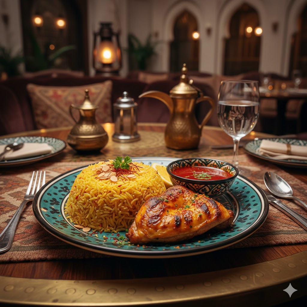 الأرز بالزعفران مع الدجاج المشوي: فخامة المطبخ الخليجي في طبق واحد