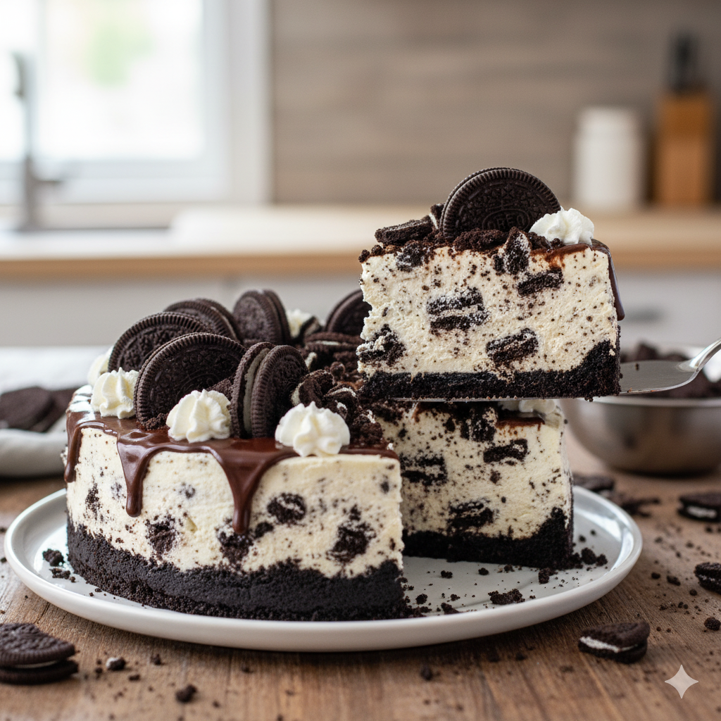 بعد التبريد والتزيين، ستحصلين على تشيز كيك بارد أنيق ولذيذ، مثالي لتقديمه في المناسبات أو للاستمتاع بتحلية منعشة في أي وقت. كل قضمة تمنحك مزيجاً مثالياً من الأوريو والغنى الكريمي لا يُقاوم!