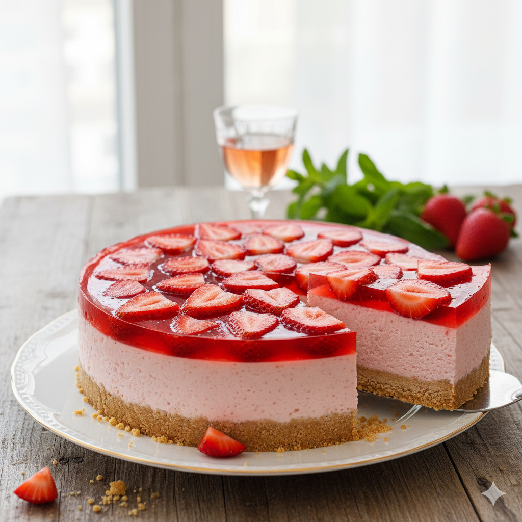 تشيز كيك الفراولة المنعش هو الخيار الأمثل لجميع المناسبات، يقدم تجربة حلوى صحية ولذيذة في دقائق، مع فوائد الفراولة الغذائية ومظهر جذاب يسرق الأضواء من أي مائدة.