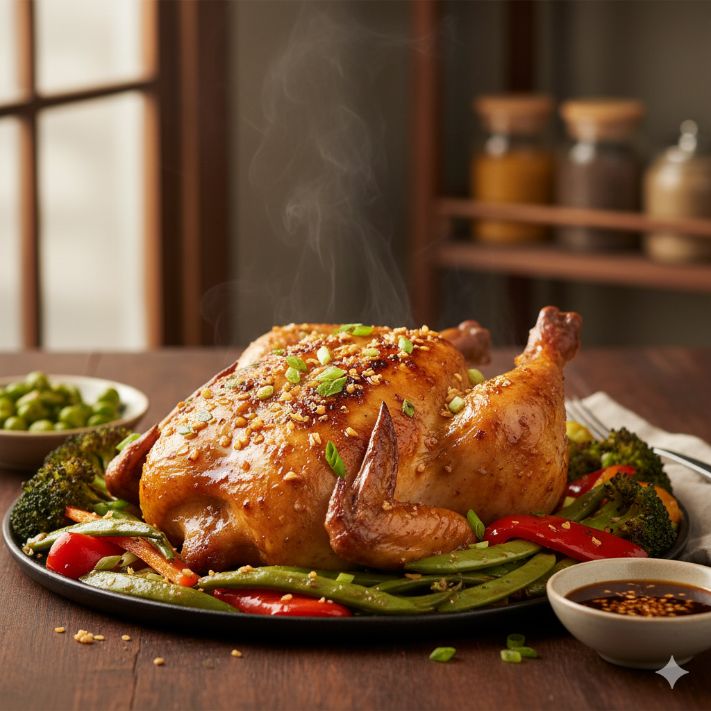 تُعد هذه الوصفة تحفة من تحف المطبخ الشرقي، حيث تجمع بين عصارة الدجاج الطرية ونكهات الزنجبيل والثوم الفريدة، مع الخضار المحمصة التي تضيف قيمة غذائية عالية. جربها لوجبة عائلية متكاملة!