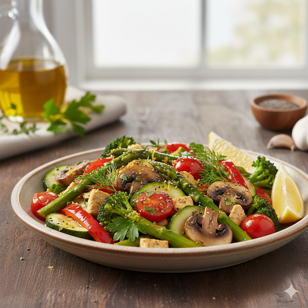 تبرز صينية الخضار المشوية بالأعشاب كتحفة فنية تجمع بين الألوان