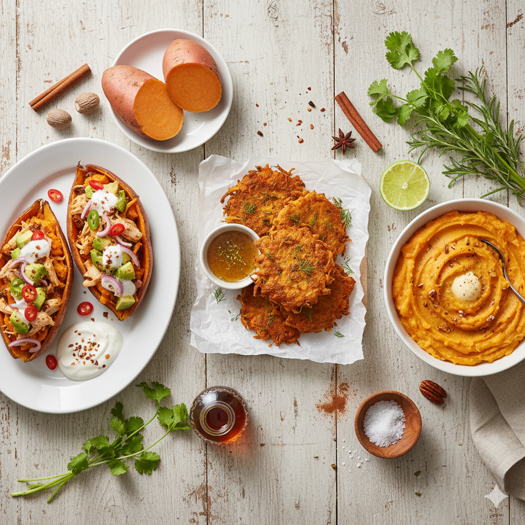 البطاطا الحلوة خيار رائع لإعداد أطباق متنوعة تجمع بين الطعم اللذيذ والفوائد الصحية. إليك تشكيلة من أطيب الوصفات التي يمكنك تقديمها في مختلف الوجبات:
