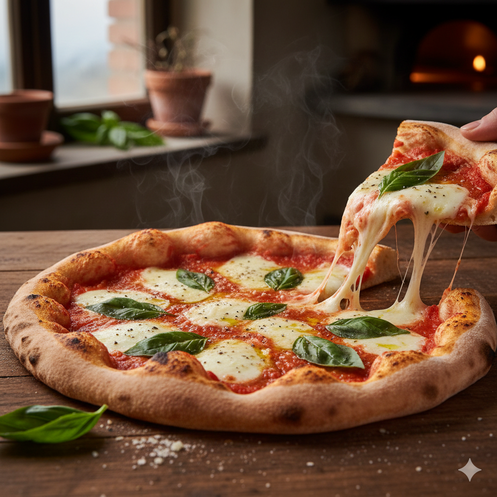 بيتزا مارغريتا هي أيقونة المطبخ الإيطالي التي تجسد فلسفة « الأقل هو الأكثر ». هذه الوصفة الأصيلة من نابولي تقدم مزيجاً متناغماً من ثلاث مكونات أساسية فقط ترمز لألوان العلم الإيطالي: الأحمر (الطماطم)، الأبيض (الموزاريلا)، والأخضر (الريحان). جربوا هذه التحفة البسيطة التي ستأخذكم في رحلة إلى شوارع إيطاليا!